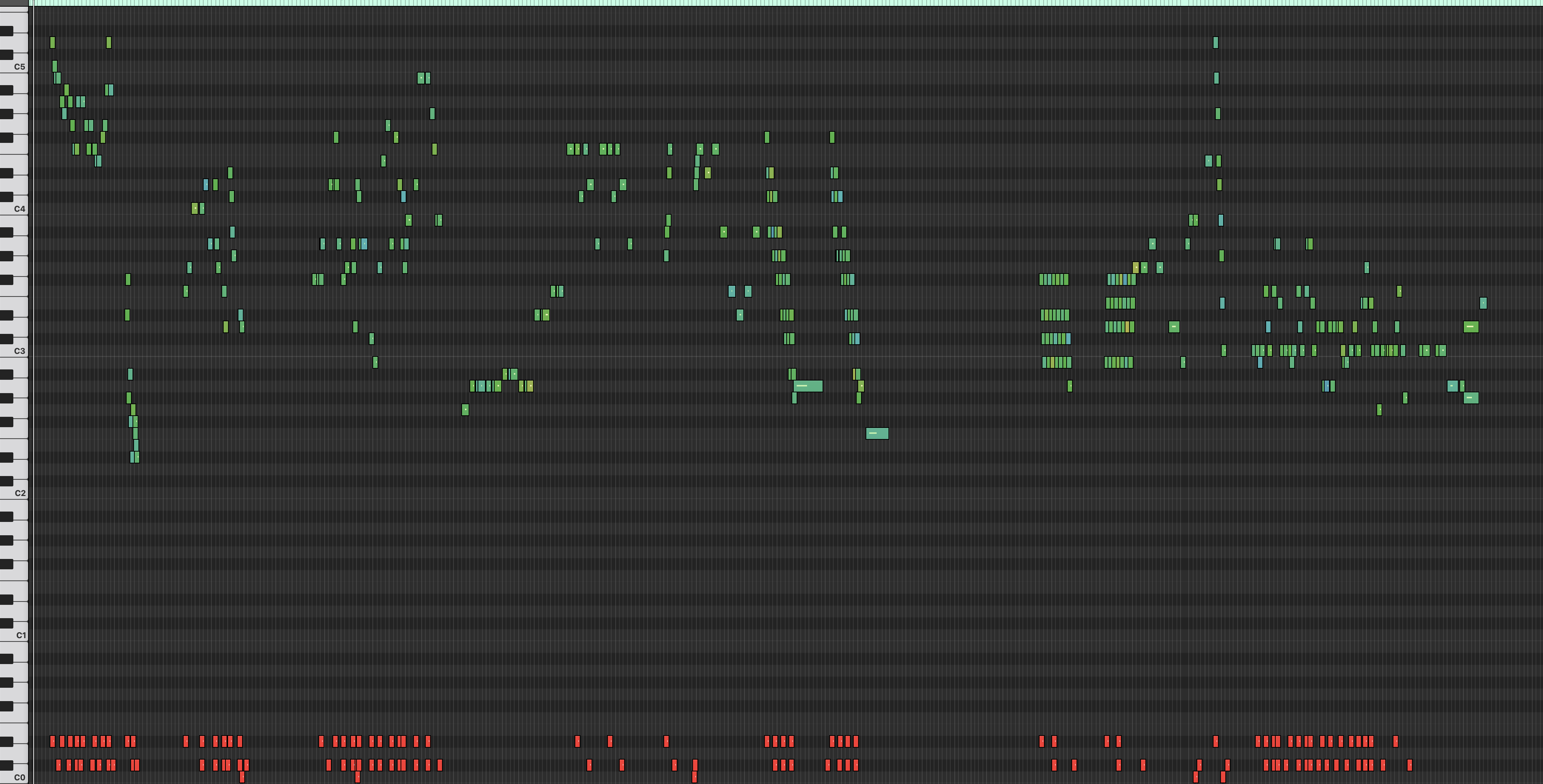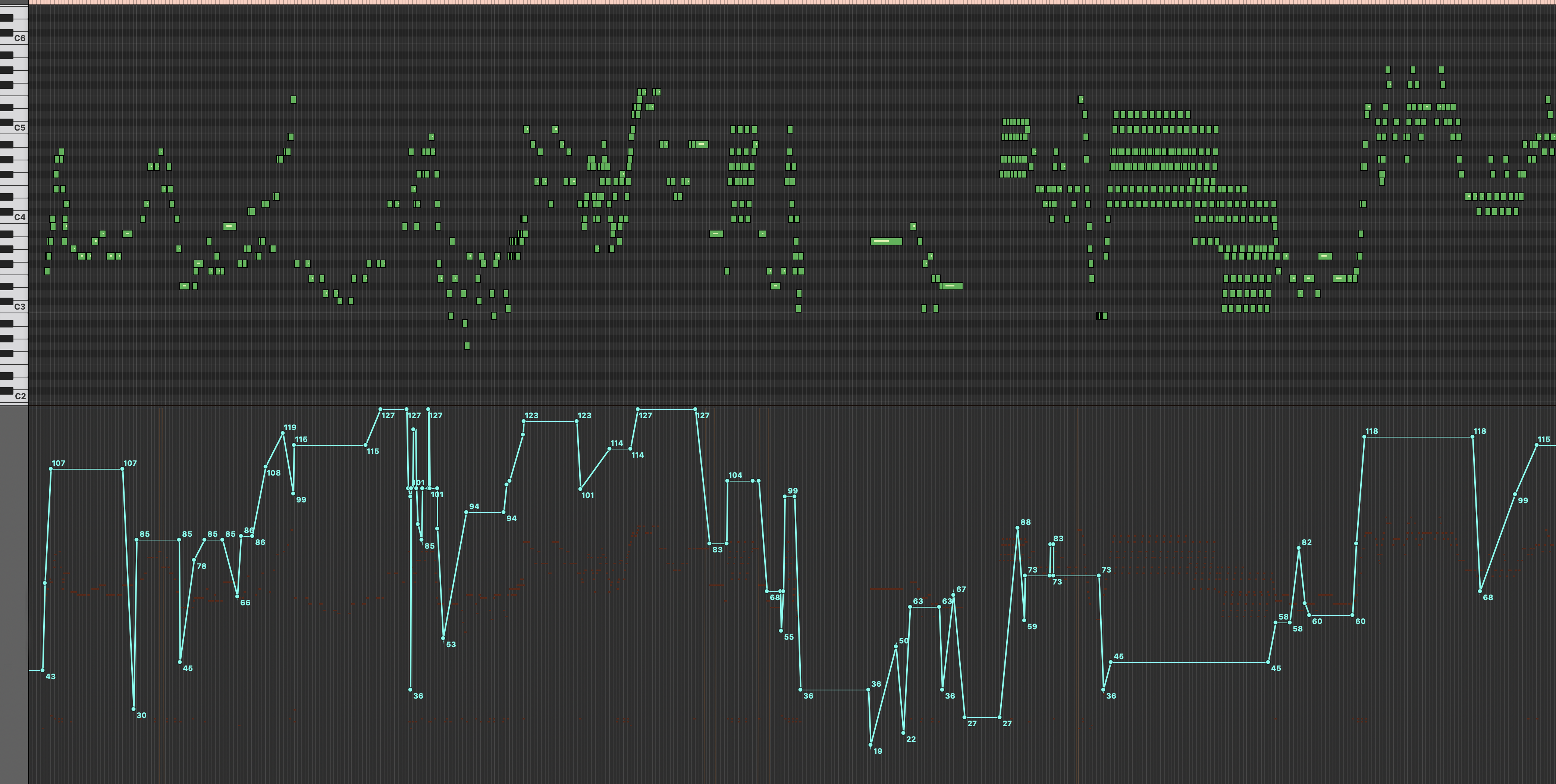 To switch between the various articulations (staccato, sustained, legato, sforzando, trills etc.), it was necessary to input key-switches (low MIDI notes) for each instrument. Figure 46 shows the key-switches for the first clarinet part in the Piano Roll editor.